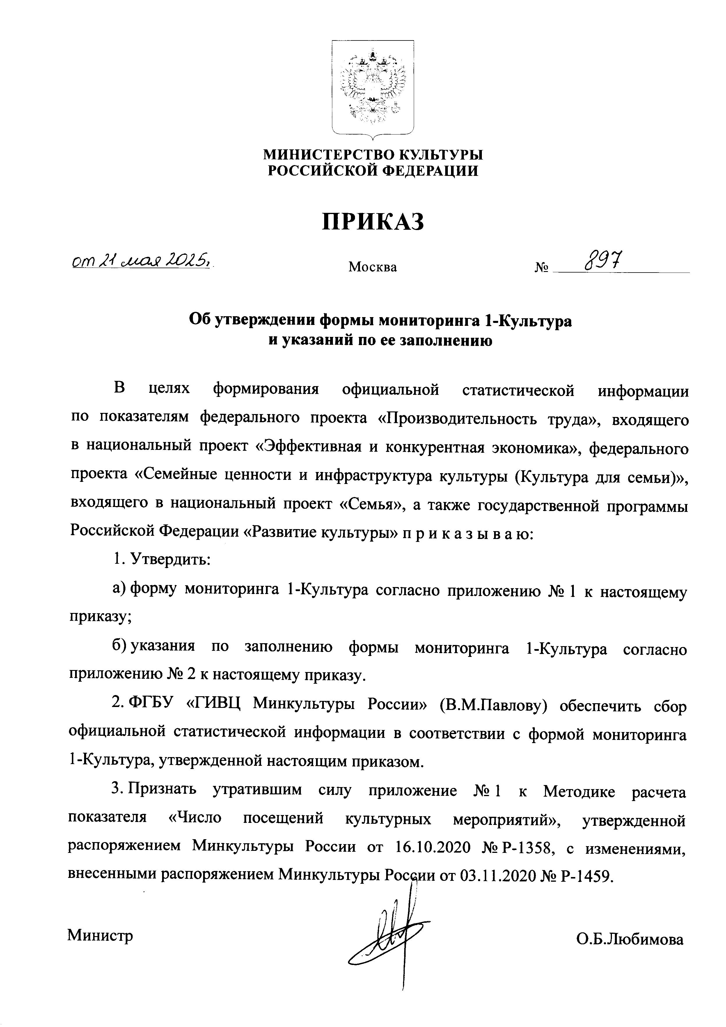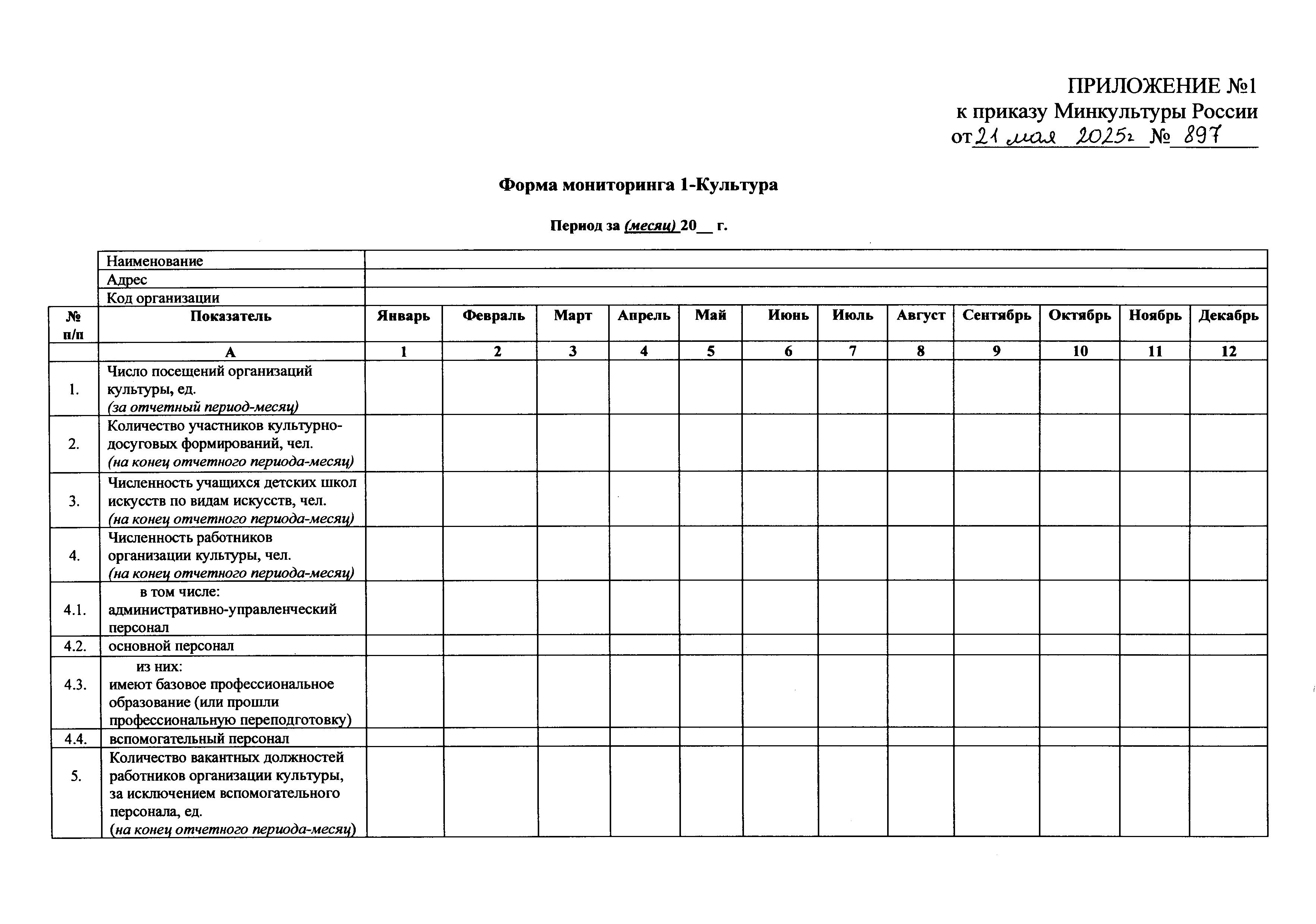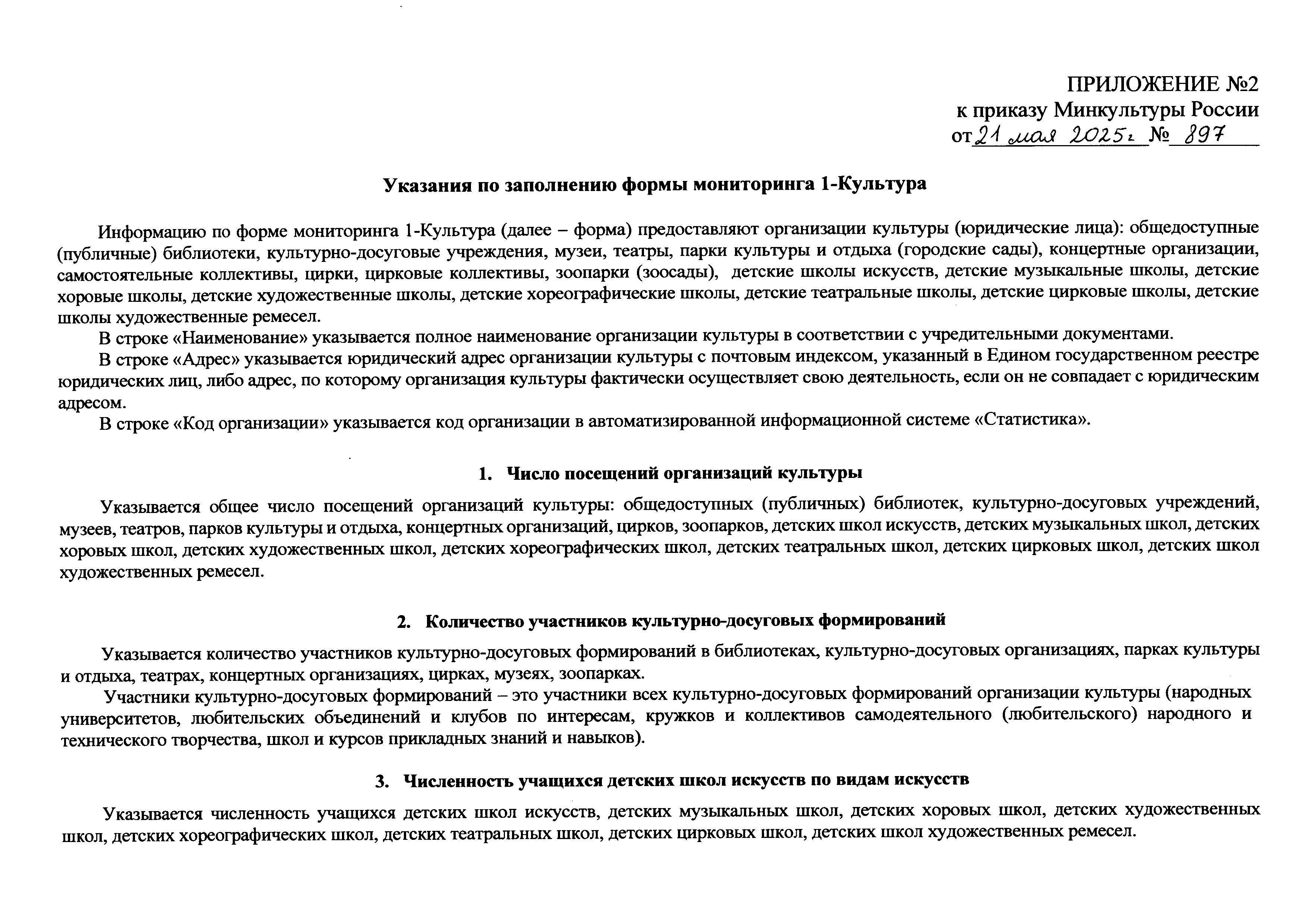 Приказ Министерства культуры Российской Федерации от 21.05.2025г. № 897 «Об утверждении формы мониторинга 1-Культура и указаний по ее заполнению»