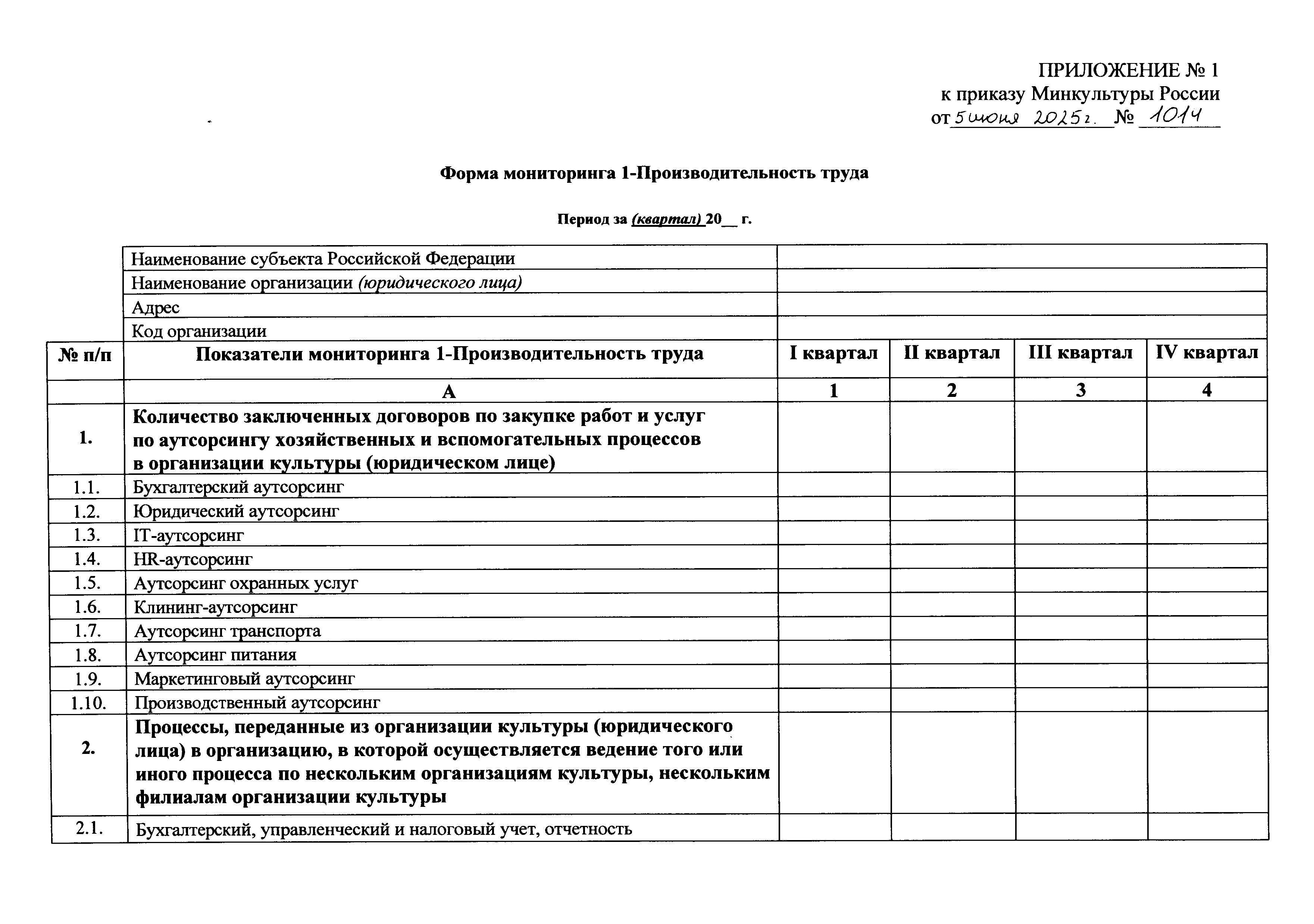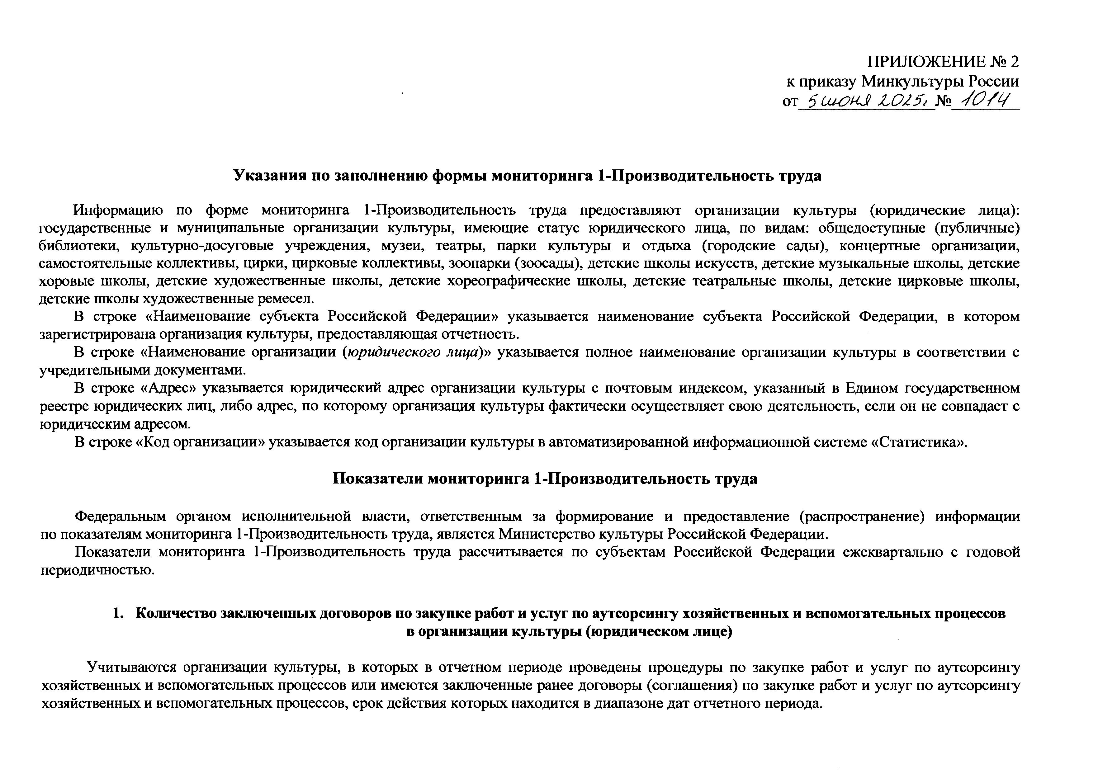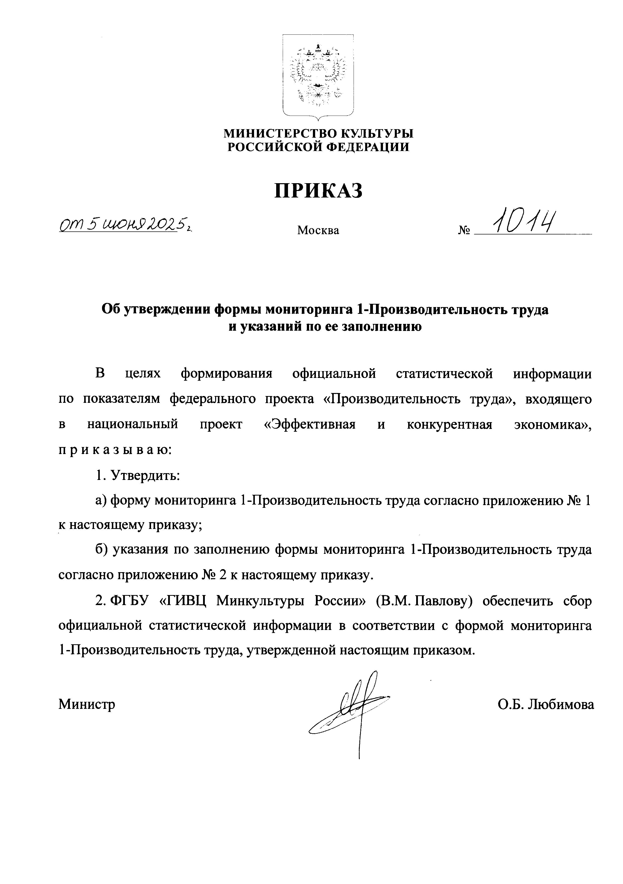 Приказ Министерства культуры Российской Федерации от 05.06.2025г. № 1014 «Об утверждении формы мониторинга 1-Производительность труда и указаний по ее заполнению»