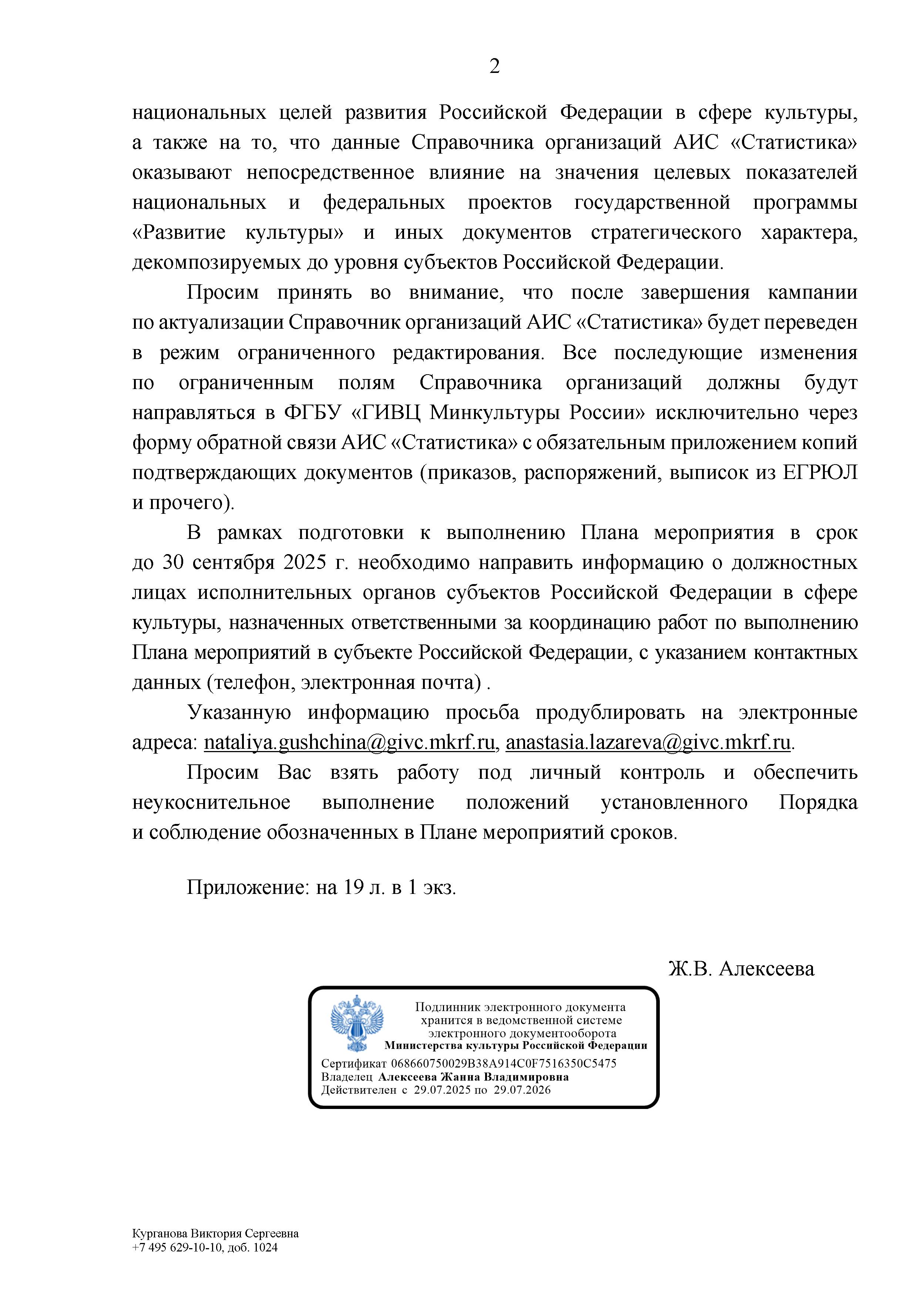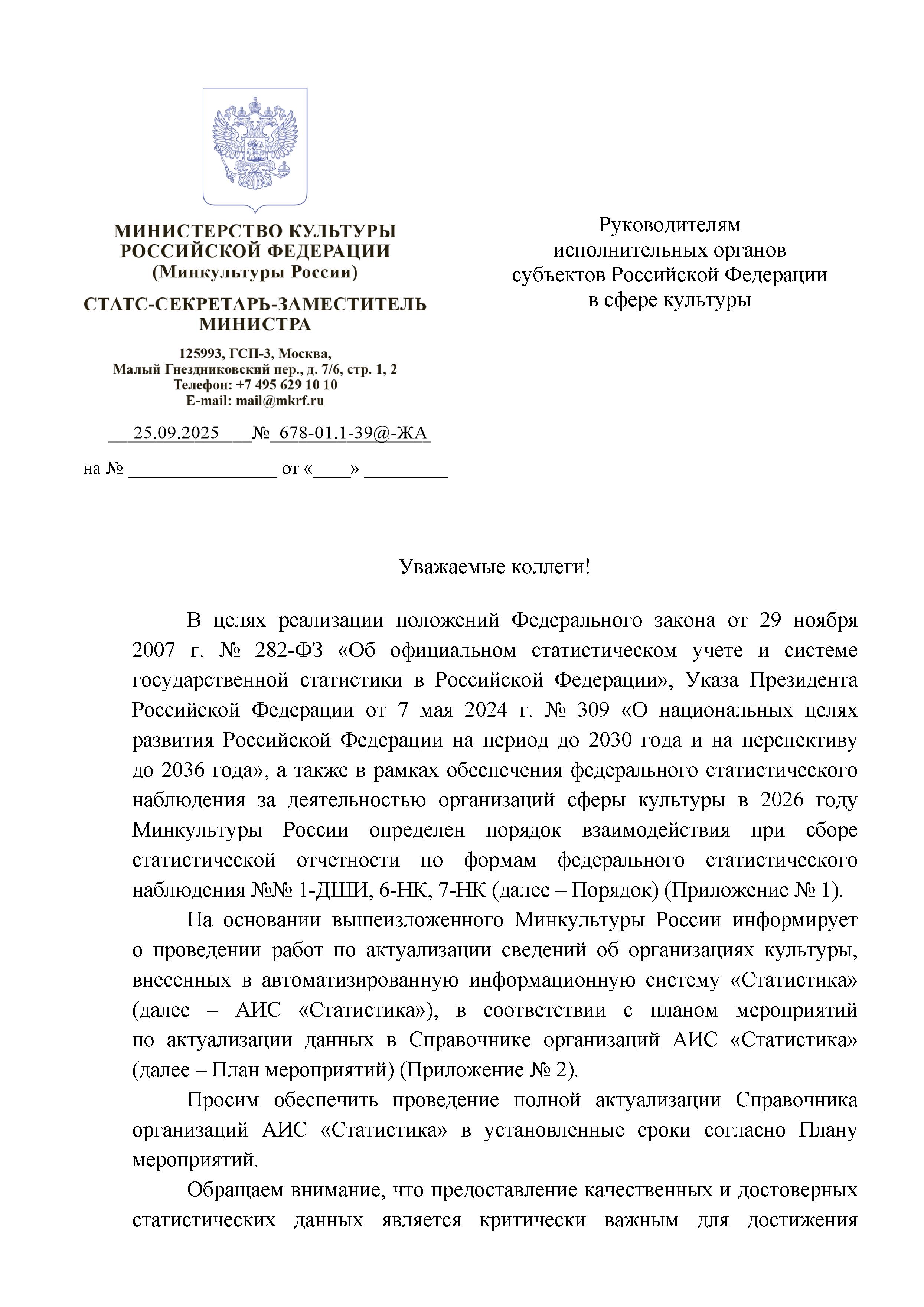 Письмо Министерства культуры Российской Федерации от 25.09.2025г. № 678-01.1-39@-ЖА